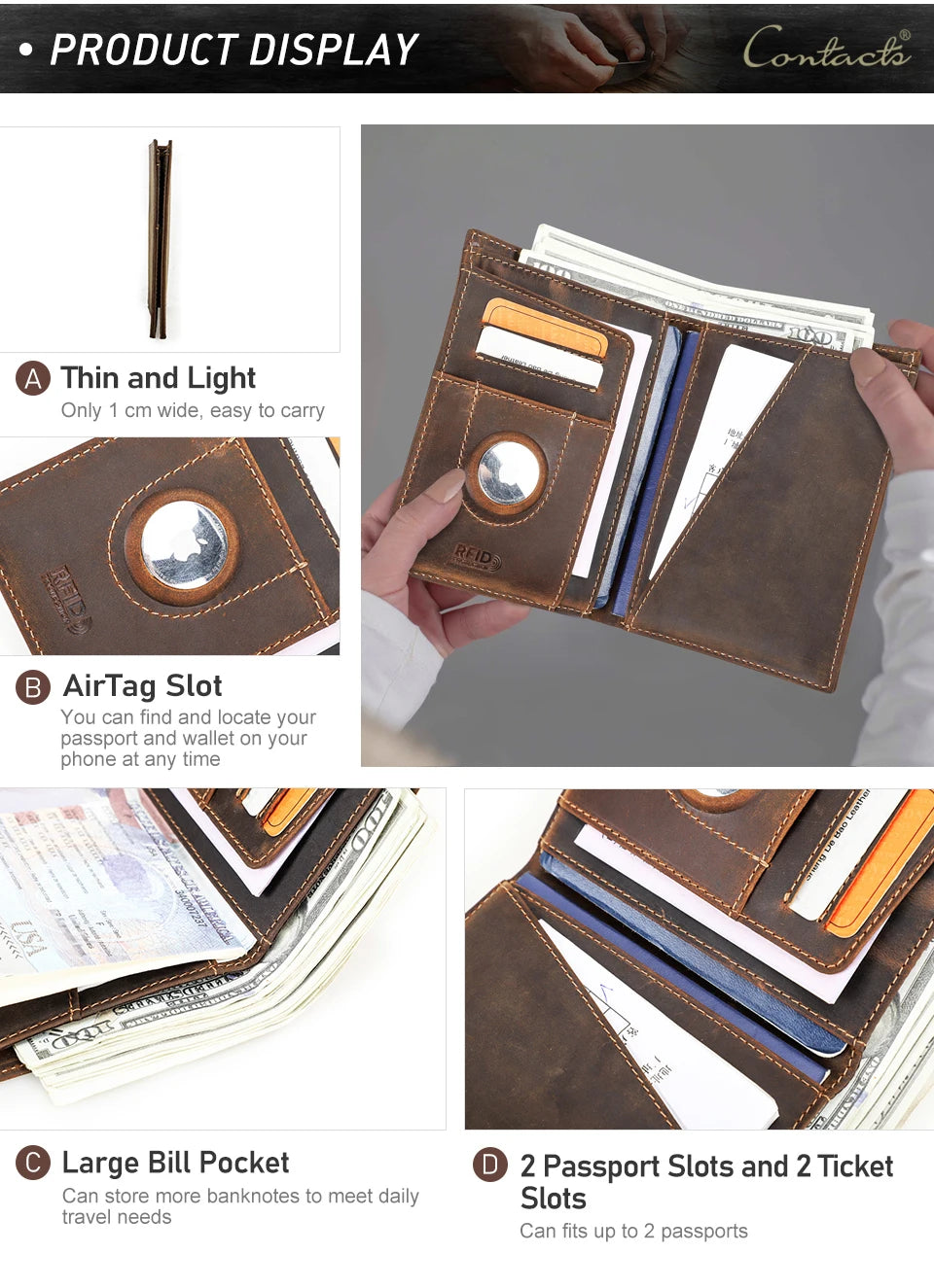 L’innovation moderne se retrouve dans l’inclusion d’un emplacement pour AirTag. Bien que l’accessoire ne contienne pas l’AirTag lui-même, cette fonctionnalité permet de suivre vos documents de voyage en temps réel grâce à la technologie Apple. Cette option renforce encore la sécurité, en vous assurant que votre passeport et vos cartes restent localisés même en cas de perte ou d’oubli. C’est une avancée majeure pour les voyageurs qui recherchent sécurité et tranquillité d’esprit.
